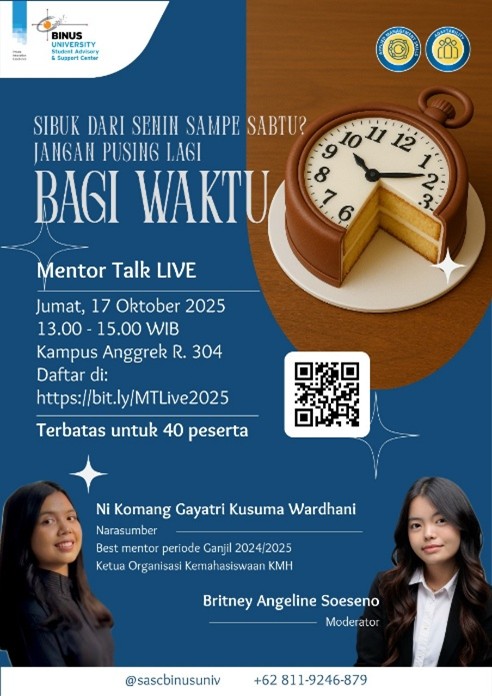 Student Advisory & Support Center Kemanggisan sub-unit Mentoring berkesempatan untuk mengadakan Mentor Talk Live : “Sibuk dari Senin sampai Sabtu? Jangan Pusing Lagi Bagi Waktu”, yang berlangsung pada hari Jumat, 17 Oktober 2025 di kampus Binus Anggrek ruang 304.
