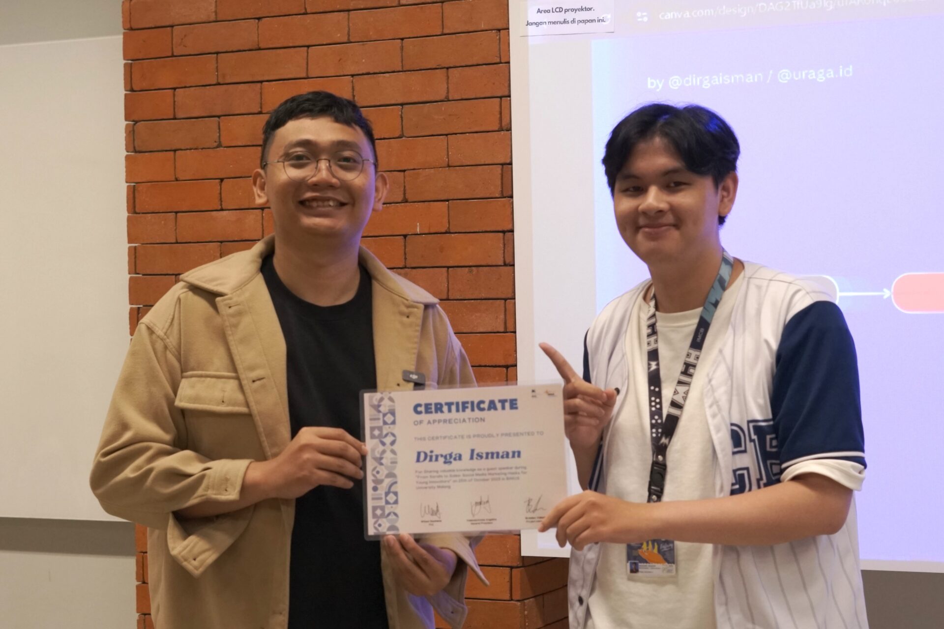 Workshop ini menghadirkan Kak Dirga Isman, CEO sekaligus Founder dari Uraga Digital, yang berbagi pengalaman dan wawasan praktis tentang dunia digital marketing. Melalui sesi interaktif dan pemaparan inspiratif, peserta diajak memahami strategi membangun personal branding, mengelola konten kreatif di media sosial, serta mengoptimalkan platform digital sebagai sarana pengembangan karier dan bisnis.