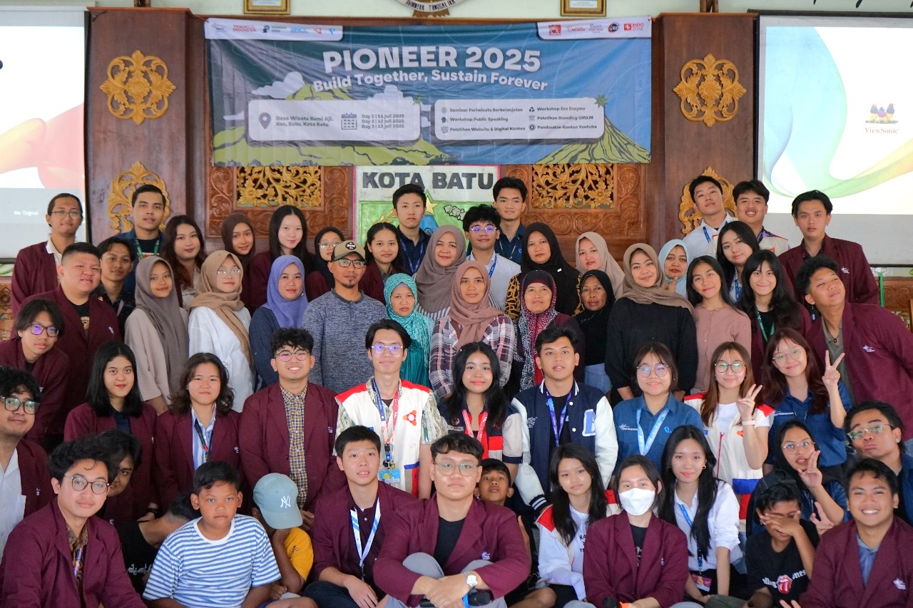 Malang, Juli 2025 — Program PIONEER sukses diselenggarakan oleh mahasiswa BINUS @Malang melalui kolaborasi tiga organisasi: TFISC (TFI Student Community), BNCC (Bina Nusantara Computer Club), dan Panorama. Program ini berlangsung selama tiga hari, dari tanggal 11 hingga 13 Juli 2025, bertempat di Pendopo LPMD Desa Wisata Agro Bumiaji, Kota Batu, Malang. Mengusung tema “Membangun Pariwisata Berkelanjutan” dan slogan “Build Together, Sustain Forever”, PIONEER hadir sebagai bentuk kontribusi mahasiswa dalam mendukung pariwisata lokal sekaligus memberdayakan pelaku UMKM. Kegiatan ini menjadi wadah kolaboratif antara mahasiswa dan warga desa untuk menggali potensi wisata melalui pendekatan digital dan pengembangan keterampilan.