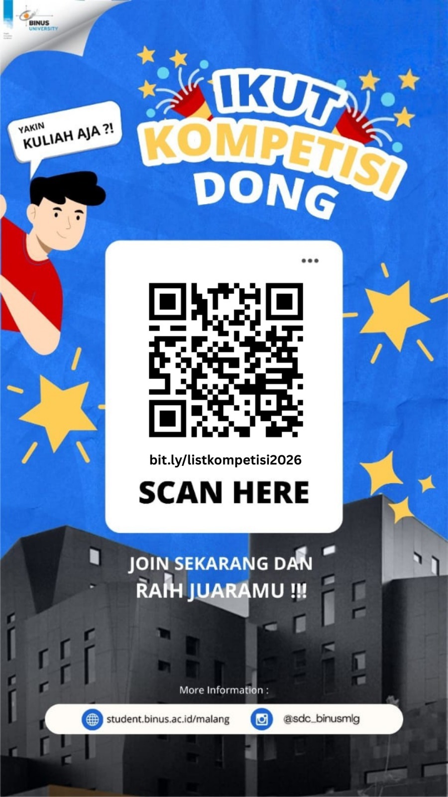 Maka dari itu, jangan ragu untuk mengambil tantangan dan keluar dari zona nyaman! Jadikan kompetisi sebagai sarana untuk mengembangkan diri, mengeksplorasi potensi, serta membangun jaringan dengan mahasiswa lain dari berbagai universitas. Dengan semangat dan tekad yang kuat, siapa pun bisa meraih kesuksesan melalui kompetisi.